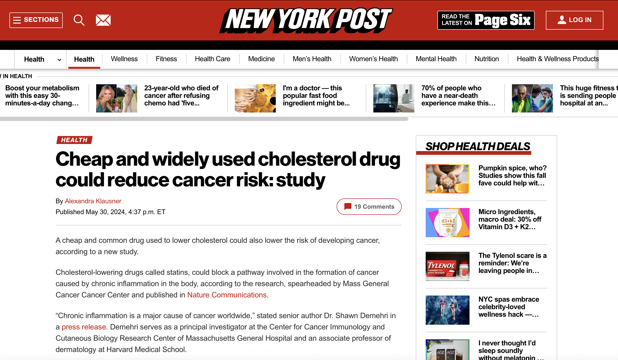 https://nypost.com/2024/05/30/health/cheap-cholesterol-drug-could-reduce-cancer-risk-study/